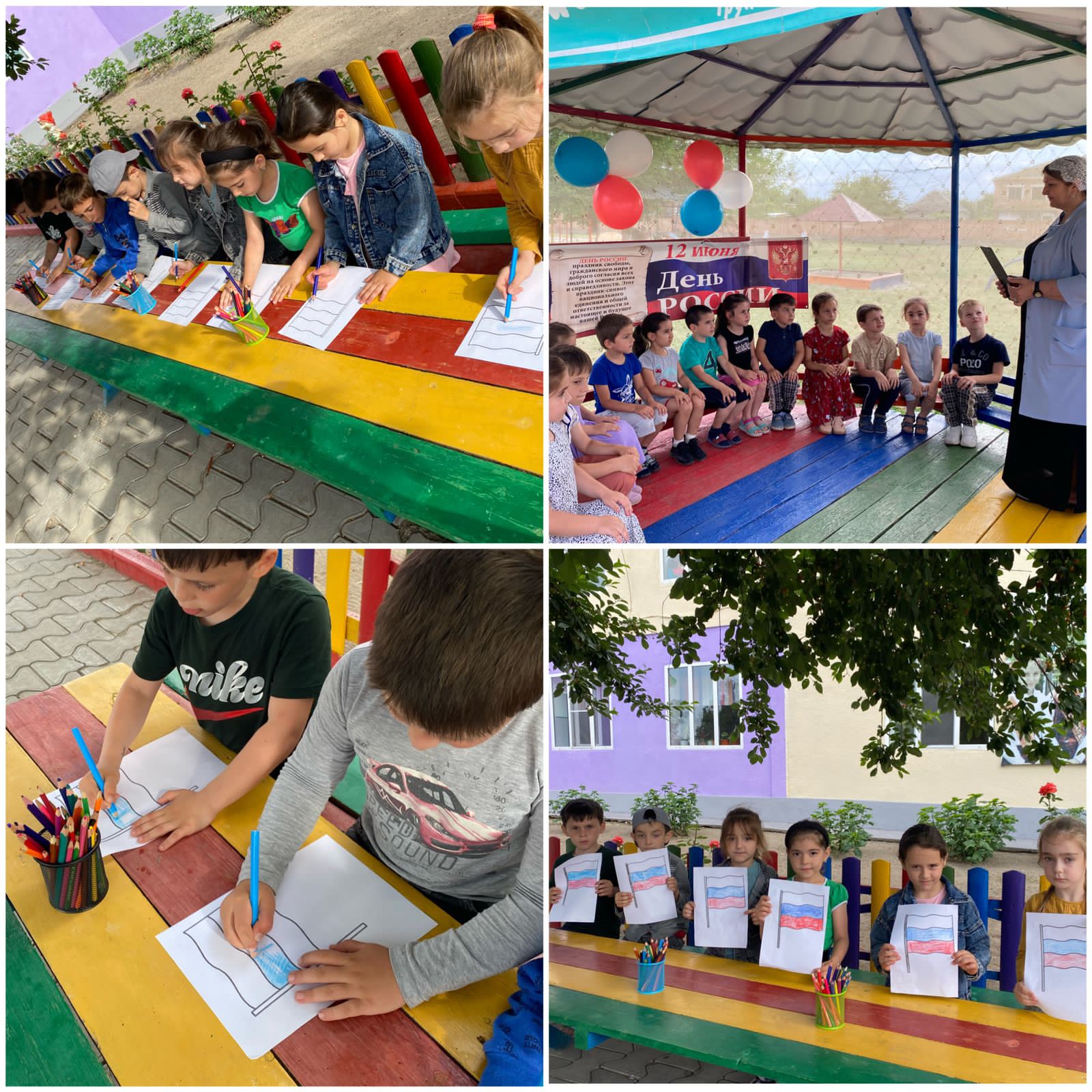 10.06.2022Накануне Дня России в нашем детском саду прошел праздник, посвященный этому событию. Детям было рассказано, что День России – это праздник свободы, мира и добра.Так же детям рассказали, почему российский флаг состоит из трех цветов, и что обозначает каждый цвет.Белый цвет – березка,Синий – неба цвет.Красная полоска – солнечный рассвет.Целью праздника, проходившего в детском саду, было формирование у детей представлений о России как о государстве, о родной стране; воспитание чувства любви к родному краю, Родине.