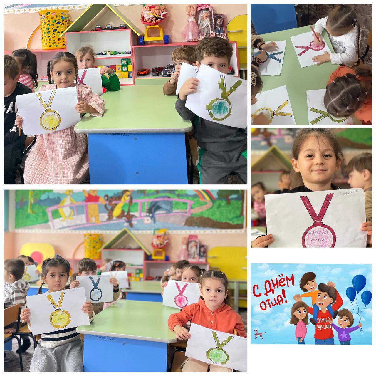 В преддверии празднования "Дня отца» в средней группе «Матрешки» воспитатель Самаева В.Д. был проведен тематический день. Вместе с детьми беседовали о папах,рассматривали иллюстрации с мужскими профессиями (полицейский, доктор, строитель, пожарный).В совместной деятельности педагога с детьми выполнили аппликацию медаль для папы «Лучший папа».