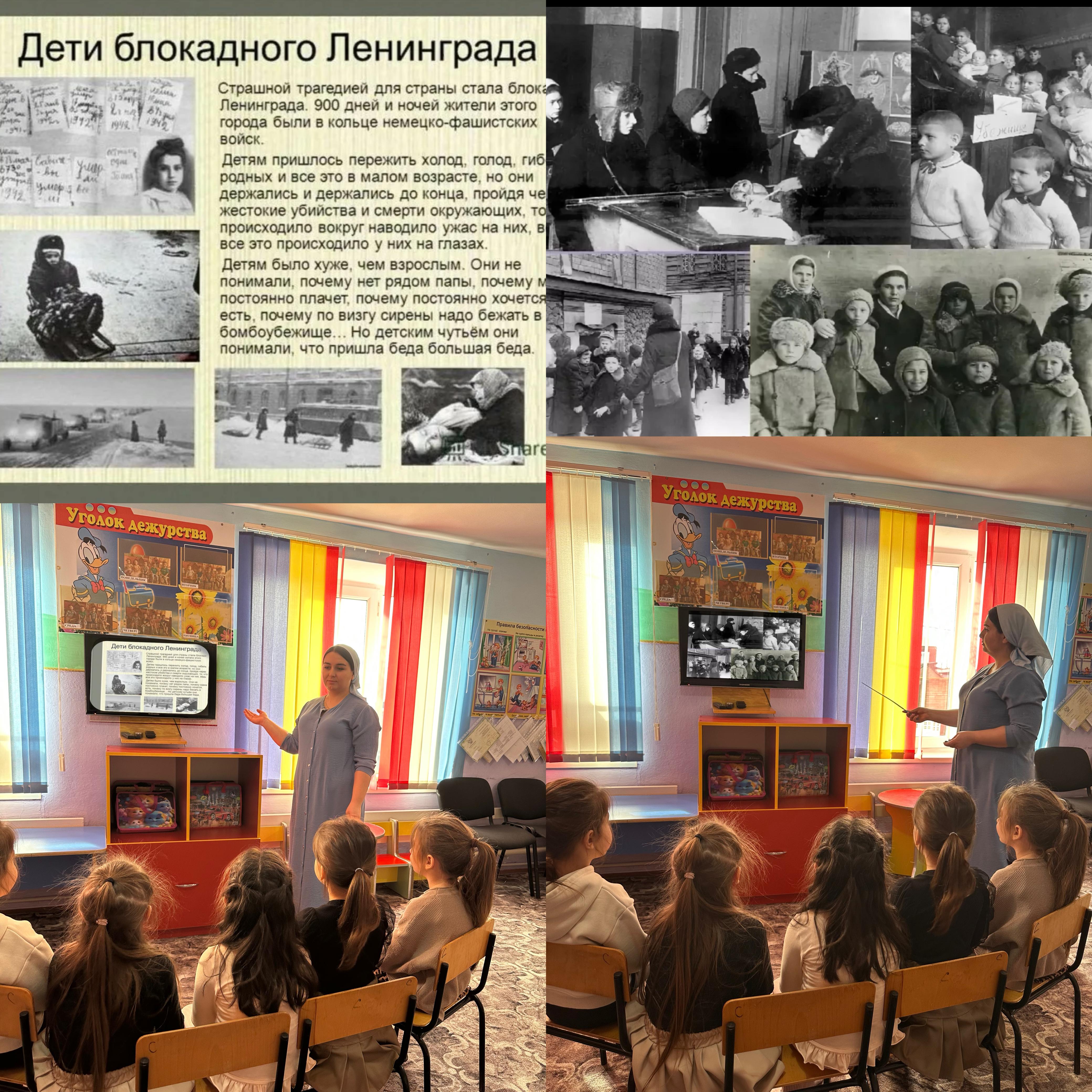 Ребятам наглядно показали (видео-слайды) и рассказали о блокаде Ленинграда, о Дороге жизни, о том как жили и выживали люди в это страшное время. Провели беседу о хлебе, о его роли в жизни ленинградцев. Дети наглядно увидели кусочек хлеба, который на протяжении многих блокадных дней оставался для человека единственным источником жизни и надежды. Воспитатель Индербиева Х.И.